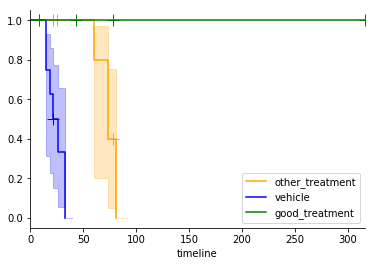 We use lifelines, a package for drawing Kaplan Meier graphs and calculating statistical significance. Helper functions convert the tumour volume measurements to survival tables that can then be plotted