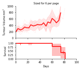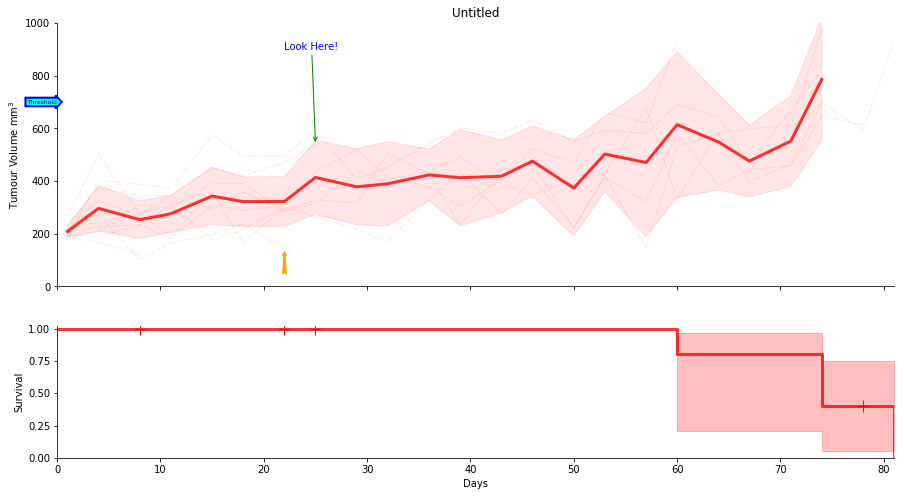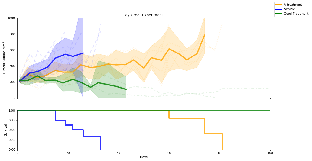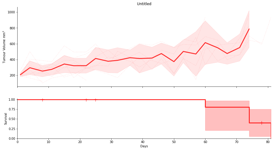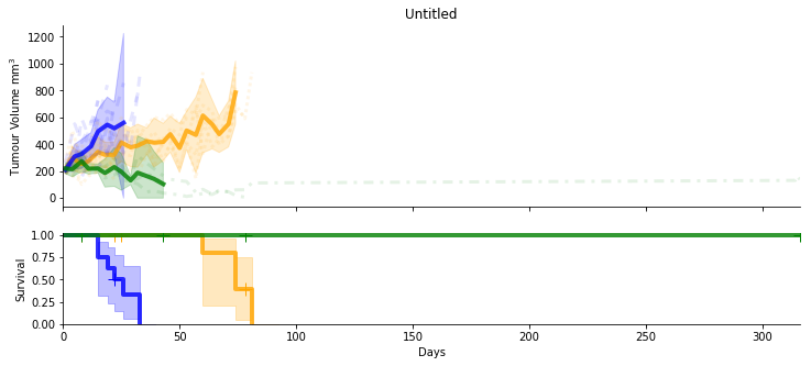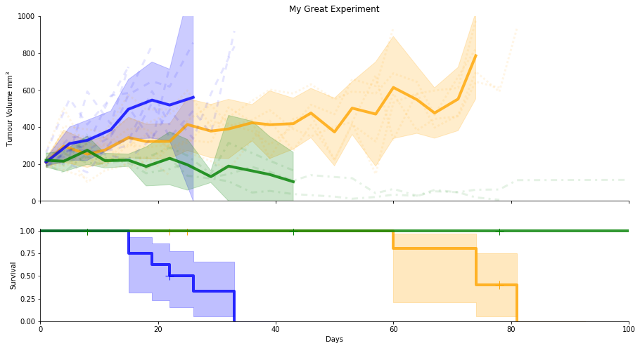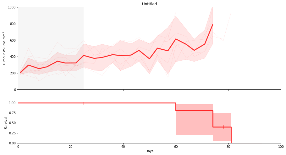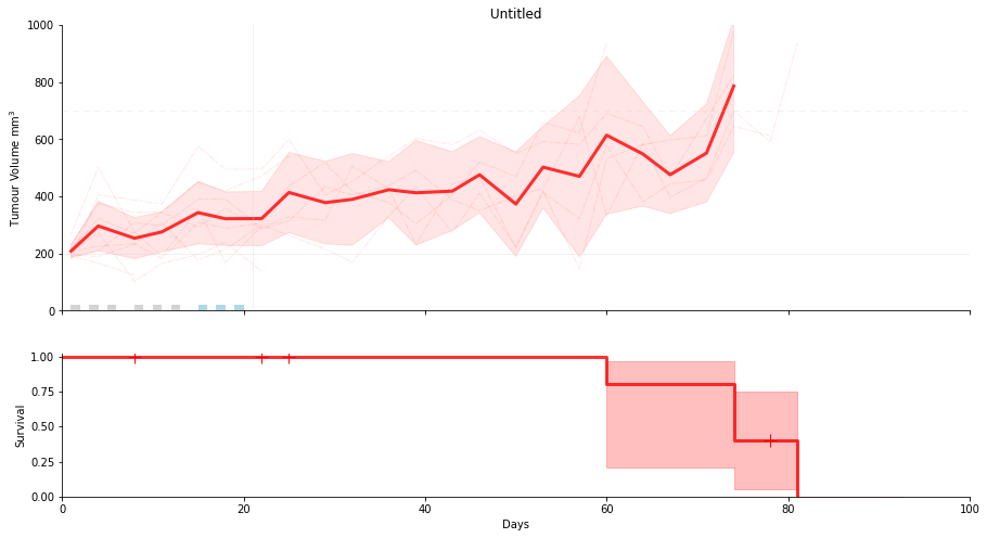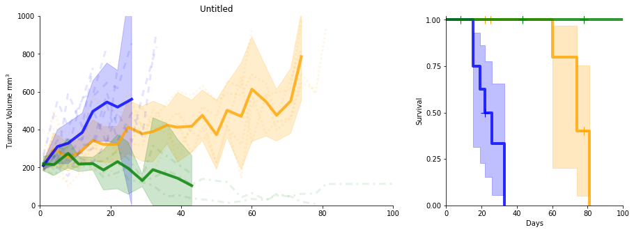 SurvivalVolume is a small python package containing a set of convenience functions for parsing tumour volume time course data and plotting line graphs with Matplotlib and Kaplan Meier curves with the package Lifelines